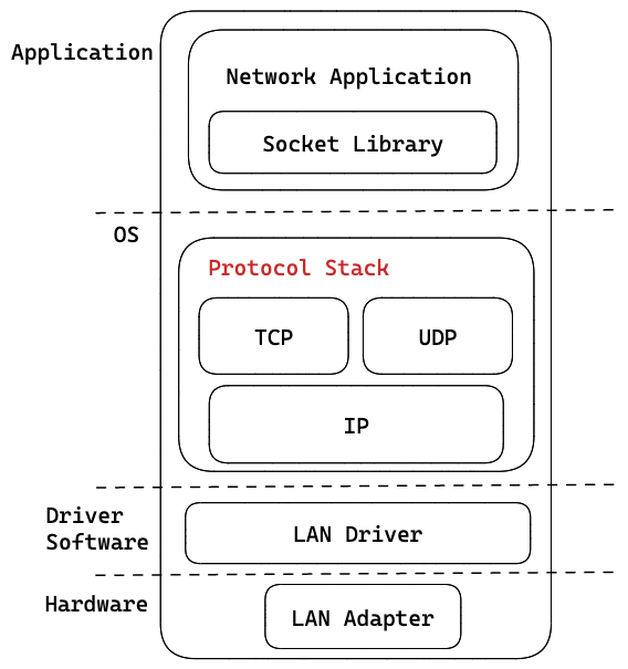이번에 정리할 프로토콜 스택은 아래 그램과 같이 OS에 내장된 네트워크 제어용 소프트웨어이다.