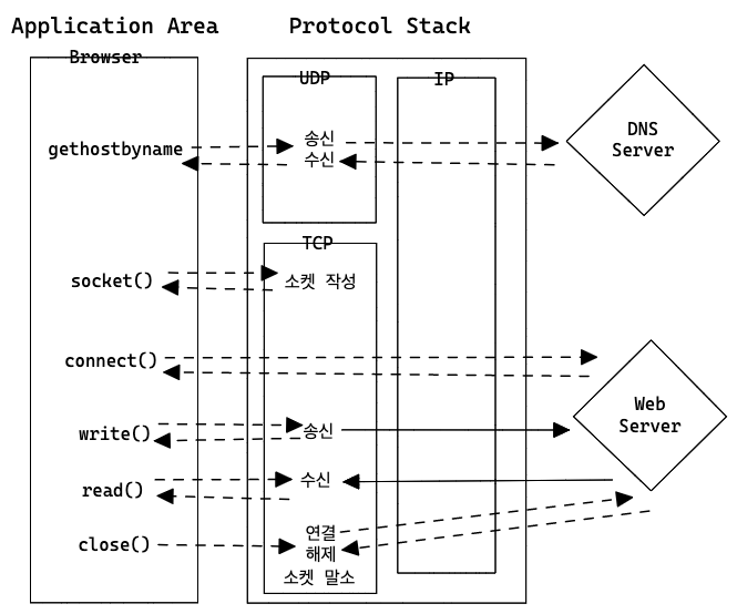 이때 프로토콜 스택은 소켓 한 개 분량의 메모리 영역을 확보한 뒤 초기 상태라는 것을 메모리 영역에 기록