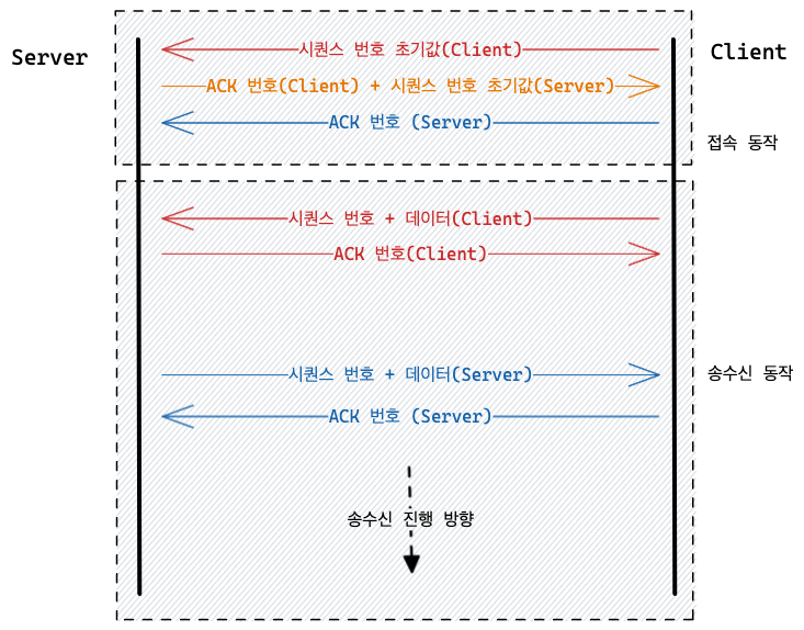 실제로는 서버 → 클라이언트, 클라이언트 → 서버로 보내는 양방향 데이터 흐름이 있기 때문에, 서버와 클라어인트 각각 시퀀스 번호를 산출해 데이터와 함께 보내고, ACK 번호를 받는다.