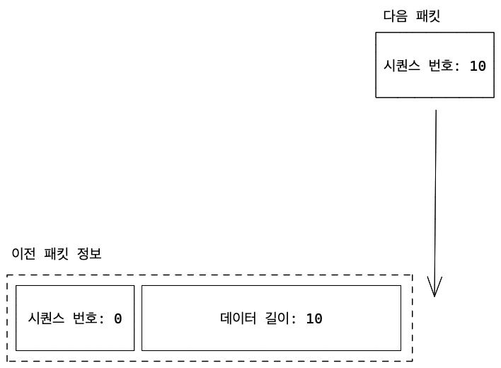 아래 그림처럼 이전 데이터의 시퀀스 번호가 0이고, 데이터 크기가 10일 경우, 그 다음 패킷의 시퀀스번호가 10이여야 패킷이 누락되지 않은 것이다.