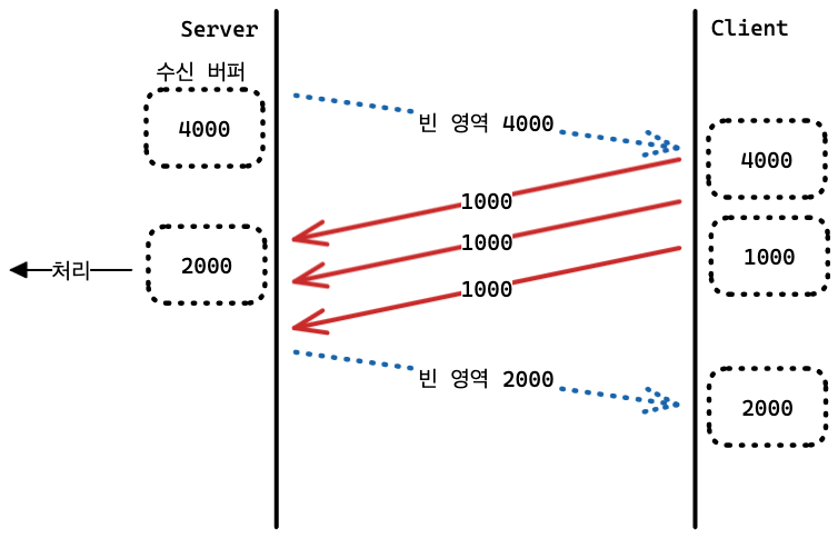 여기서 수신 가능한 데이터의 최대값을 **윈도우 사이즈(보통 수신측 버퍼 메모리 크기)**라고 한다.