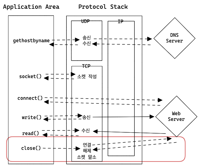 close()를 호출해 동작을 끝낸다. - 이때 서버와 마찬가지로 FIN = 1을 설정한 TCP 헤더를 만들어 서버에게 보내고 ACK 번호가 돌아오면 서버와 대화를 끝낸다.