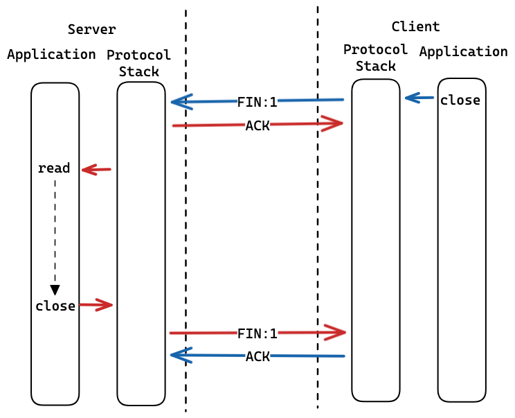 close()를 호출하는 것이다. - 프로토콜 스택은 TCP 헤드를 만드는데 여기의 FIN 비트를 1로 설정한다.