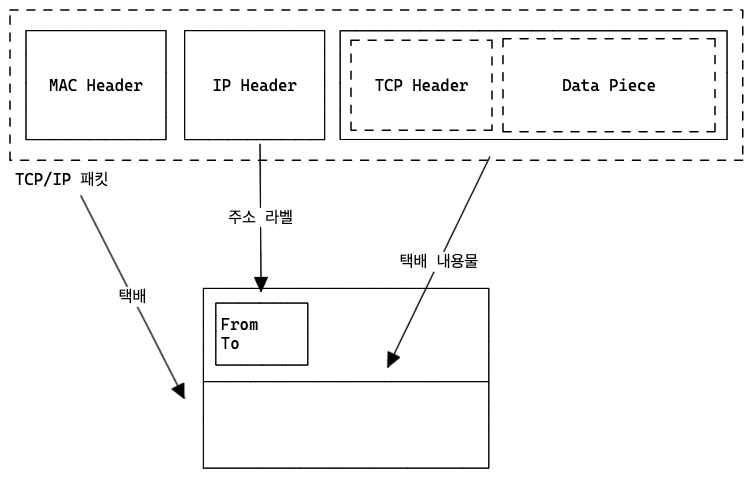 이때 IP가 처리하는 패킷은 TCP에서 만든 제어 패킷과 데이터 패킷을 분리해서 보지 않고 한 덩어리의 바이너리로 본다.